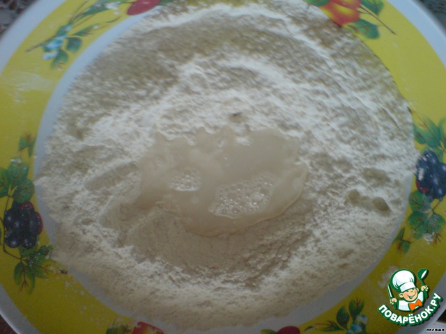 Смешиваем все сухие ингредиенты, выкладываем их горкой. Делаем углубление в нашей горке и понемногу наливаем в него воду.