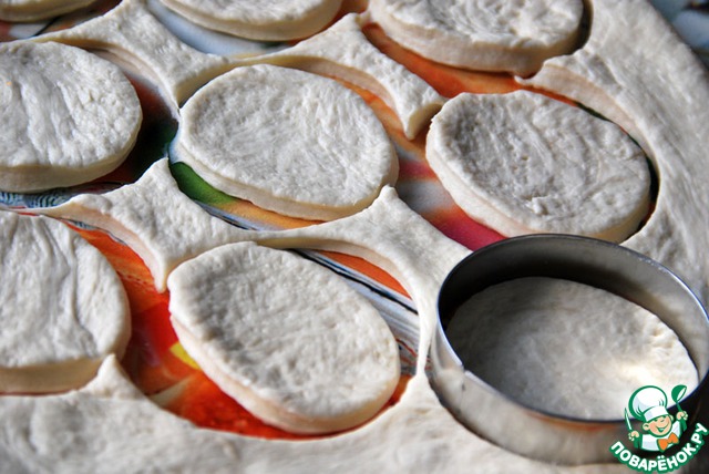 На противень положить пергамент или силиконовый коврик, выложить кружки теста по три друг на друга, смазывая каждый кружок водою. "Пирамидки" из кружков слегка придавить.