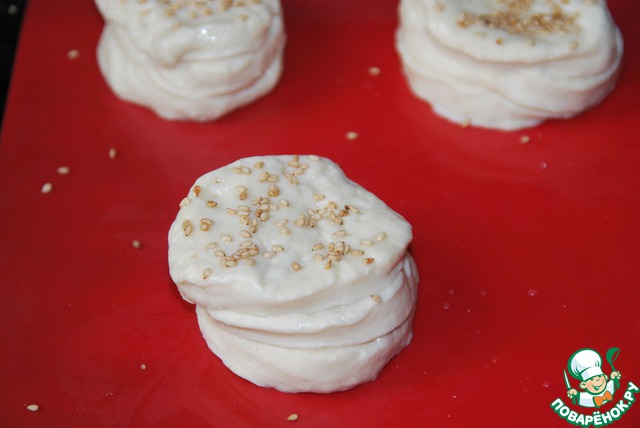 Верхний кружок смазать оливковым маслом и посыпать кунжутом. Дать хлебу (булочкам) подойти ещё 40 минут.