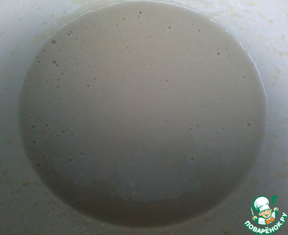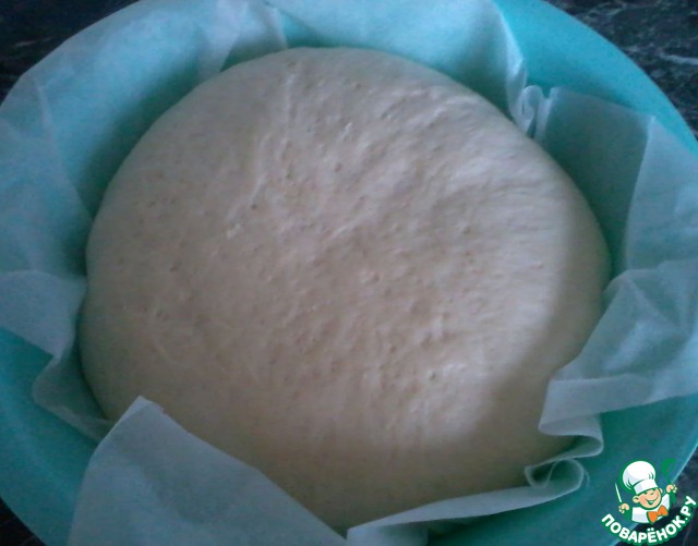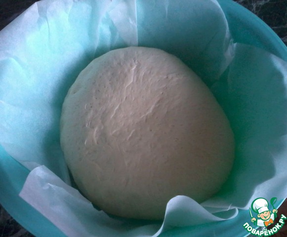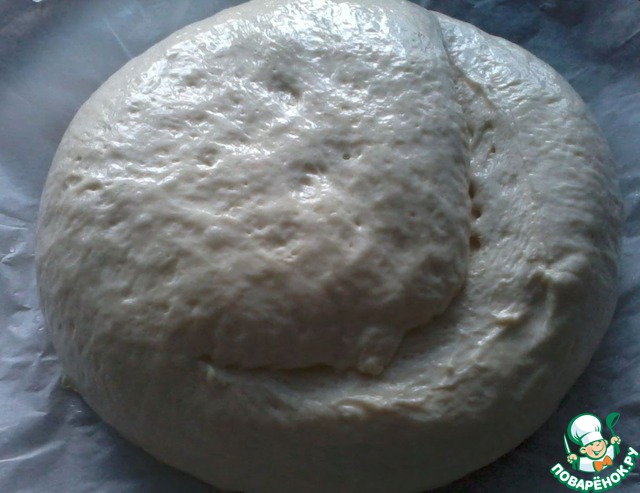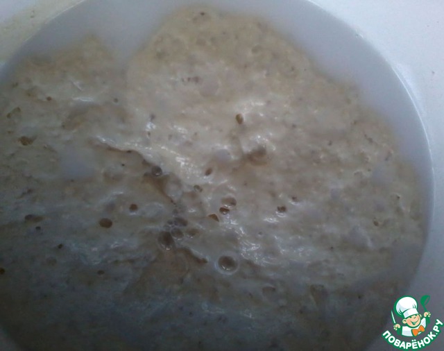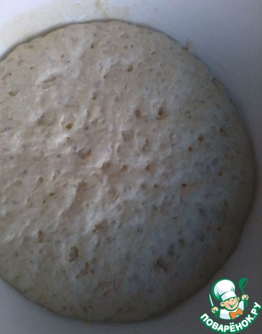 Сделать опару поздно вечером. Для этого смешать 150г просеянной муки с дрожжами (я использовала сухие), добавить 100 мл теплой воды и замесить тесто. Оно получается мягкое. Миску с тестом накрыть крышкой, сверху прикрыть полотенцем и оставить в теплом месте до утра. Утром опара выглядит так.