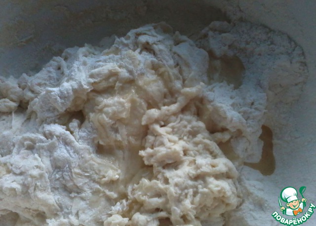 А затем постепенно добавить 350г просеянной муки ( тесто будет густое, но воду больше не добавлять!)