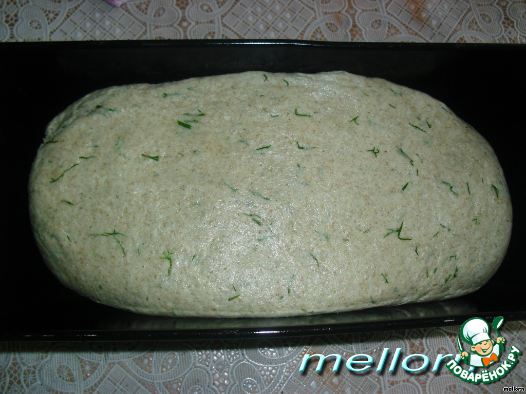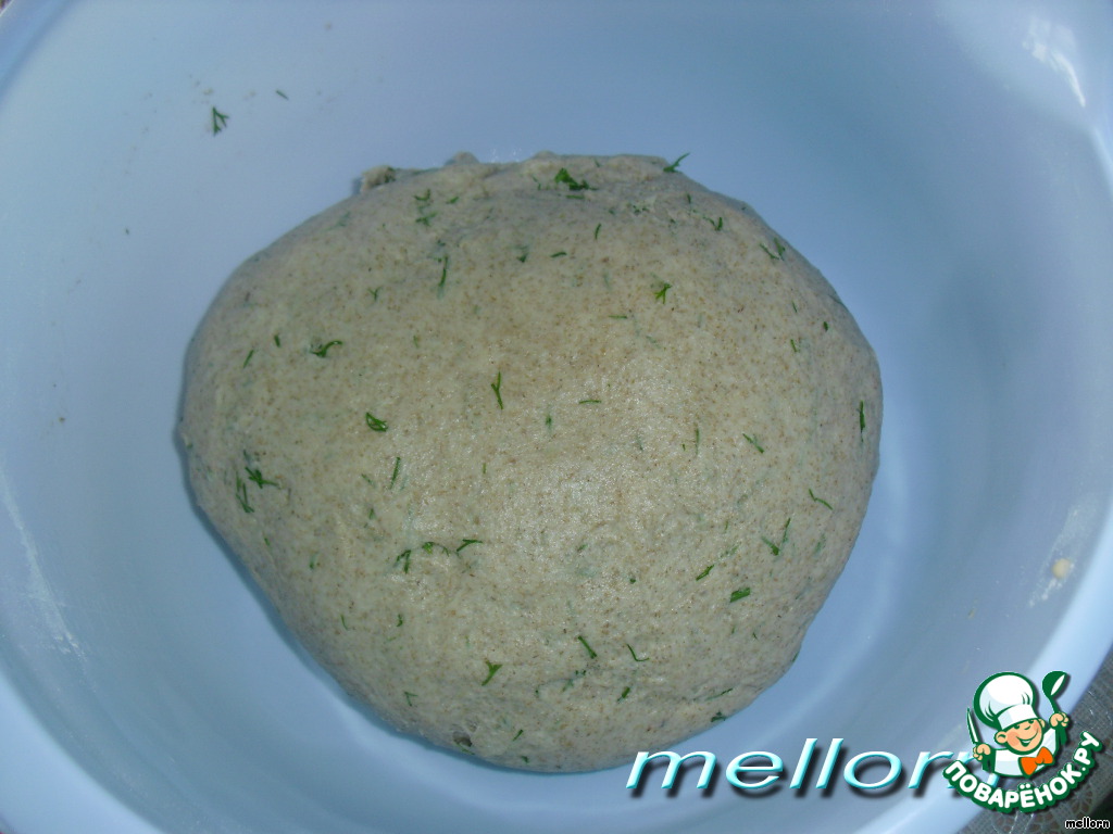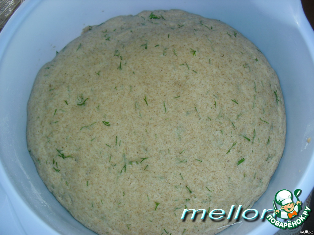 Замесить тесто из рассола, растительного масла, соли, дрожжей, укропа и муки. Тесто будет слегка «прилипать» к рукам.