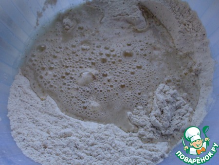 Аккуратно взвесить все ингредиенты. Смешать оба вида муки, просеяв их в одну миску. Добавить соль. Перемешать венчиком, вводя еще больше воздуха в смесь. Добавить 10 граммов свежих дрожжей. Пальцами втереть их в мучную смесь.