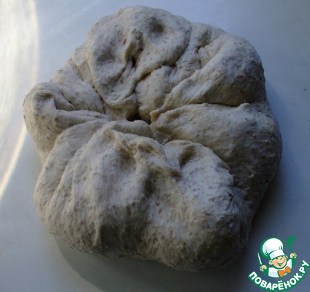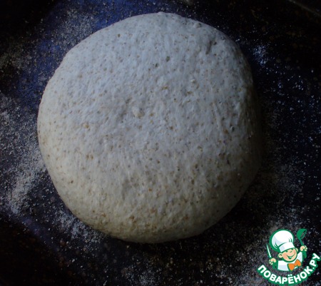 Тесто вывалить на стол, слегка смазанный маслом. Сформировать удобным для вас образом. Я слегка его растянула, а потом стала загибать концы внутрь к середине, как будто формируя булочку). И так –пока этот процесс не перестал быть невозможным. Затем, «швами» поместила его на сбрызнутый маслом и присыпанный мукой противень. Оставить на расстойку в теплом месте еще на 20-30 минут.