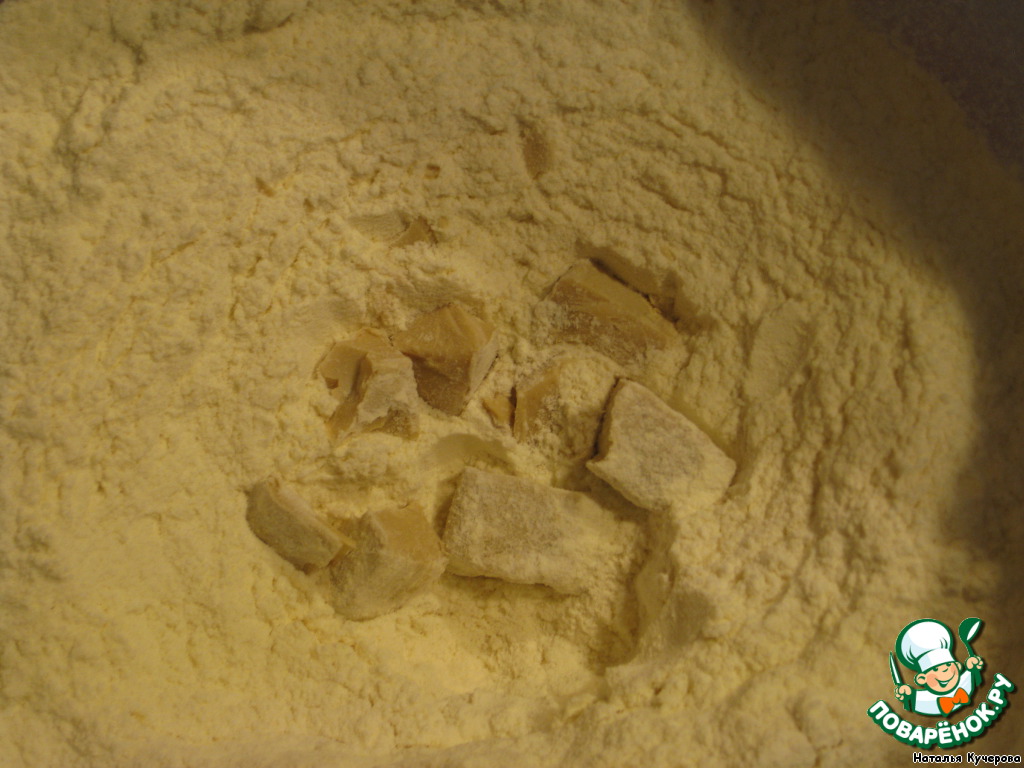 Просеять муку в миску. Дрожжи втереть в муку кончиками пальцев до образования мелкой крошки. Добавить соль и воду с молоком.