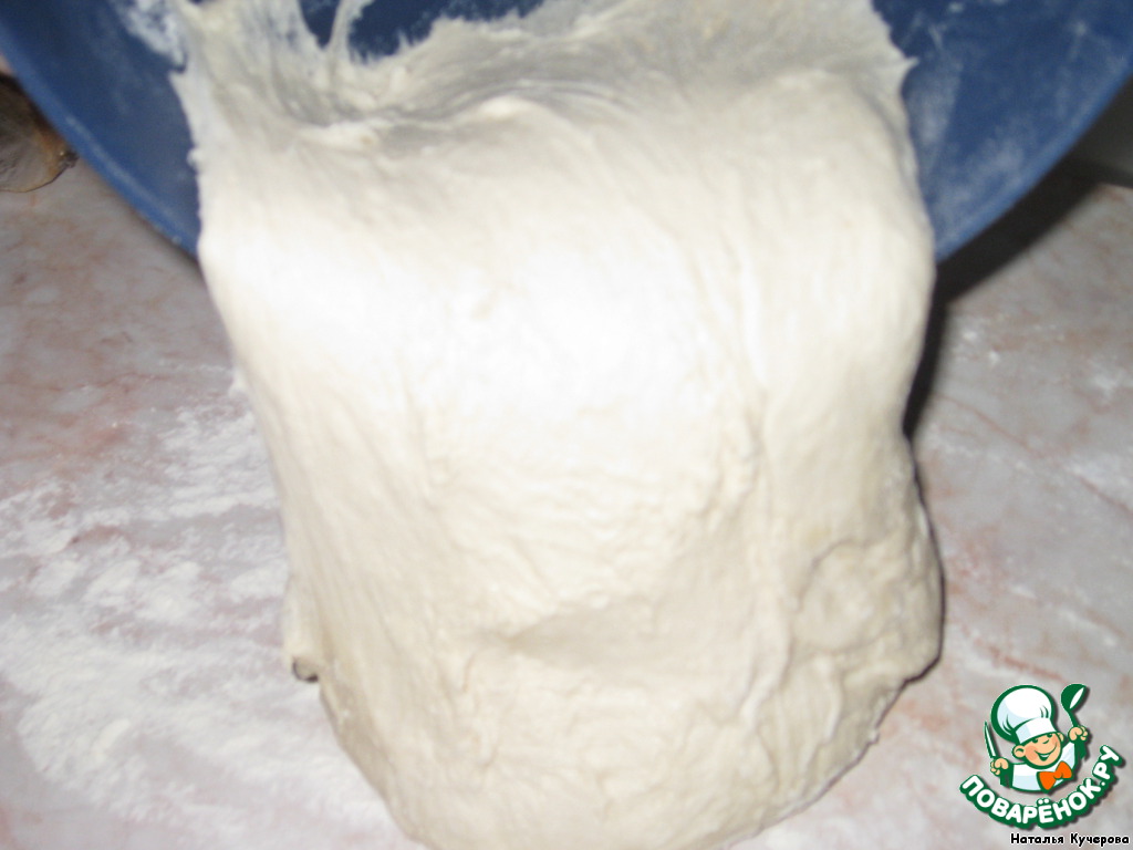 Придерживая миску одной рукой, смешивайте ингредиенты другой (или закругленной стороной скребка, если кто-то пользуется таковым) 2-3 минуты, пока тесто не начнет собираться в ком. Дальше выньте тесто из миски на рабочую поверхность. Подпылять мукой на этом этапе не нужно. Работать с тестом нужно следующим образом: С двух сторон просуньте ладони под тесто, придерживая его сверху большими пальцами. Разверните тесто в воздухе и с размаху опустите на рабочую поверхность. Потяните ближнюю к вам сторону теста на себя и вверх. Сложите пополам в направлении от себя - так, чтобы захватить побольше воздуха. Основная идея состоит в том, чтобы "поймать" внутрь теста как можно больше воздуха. В процессе работы тесто станет менее липким, более эластичным и начнет оживать у Вас в руках.