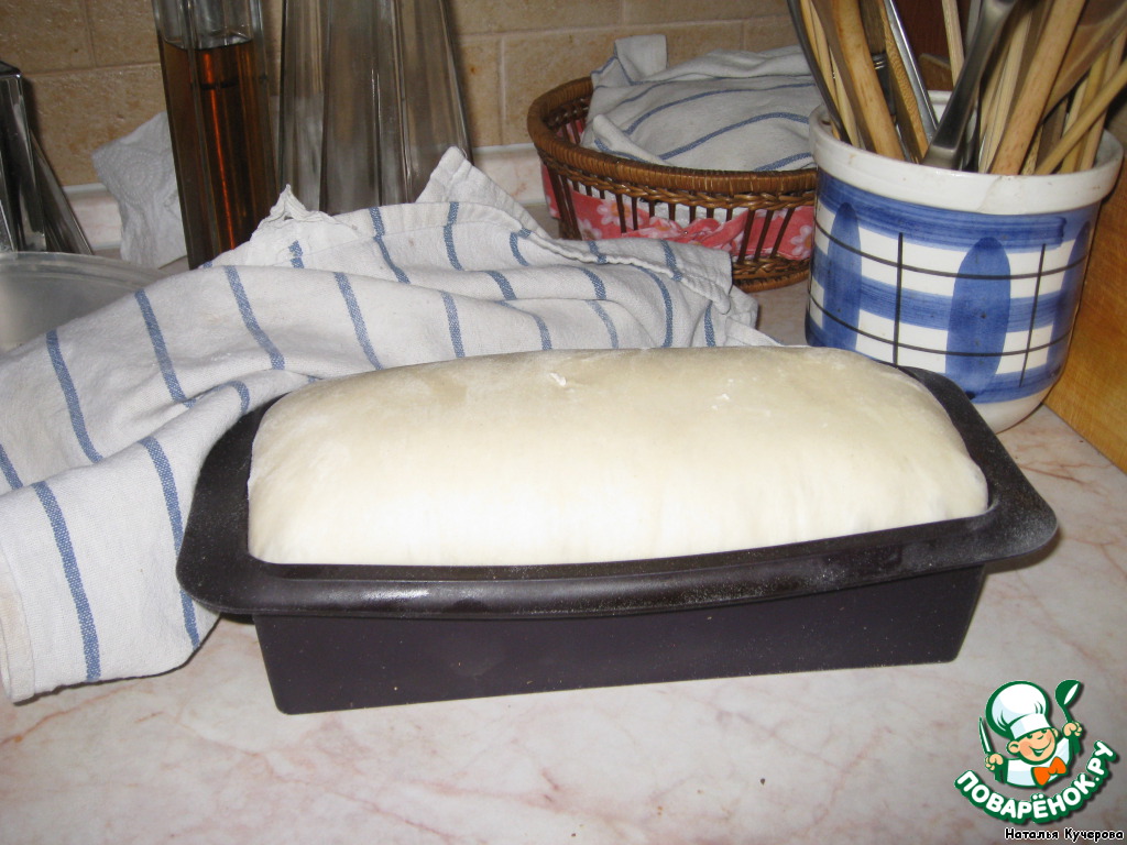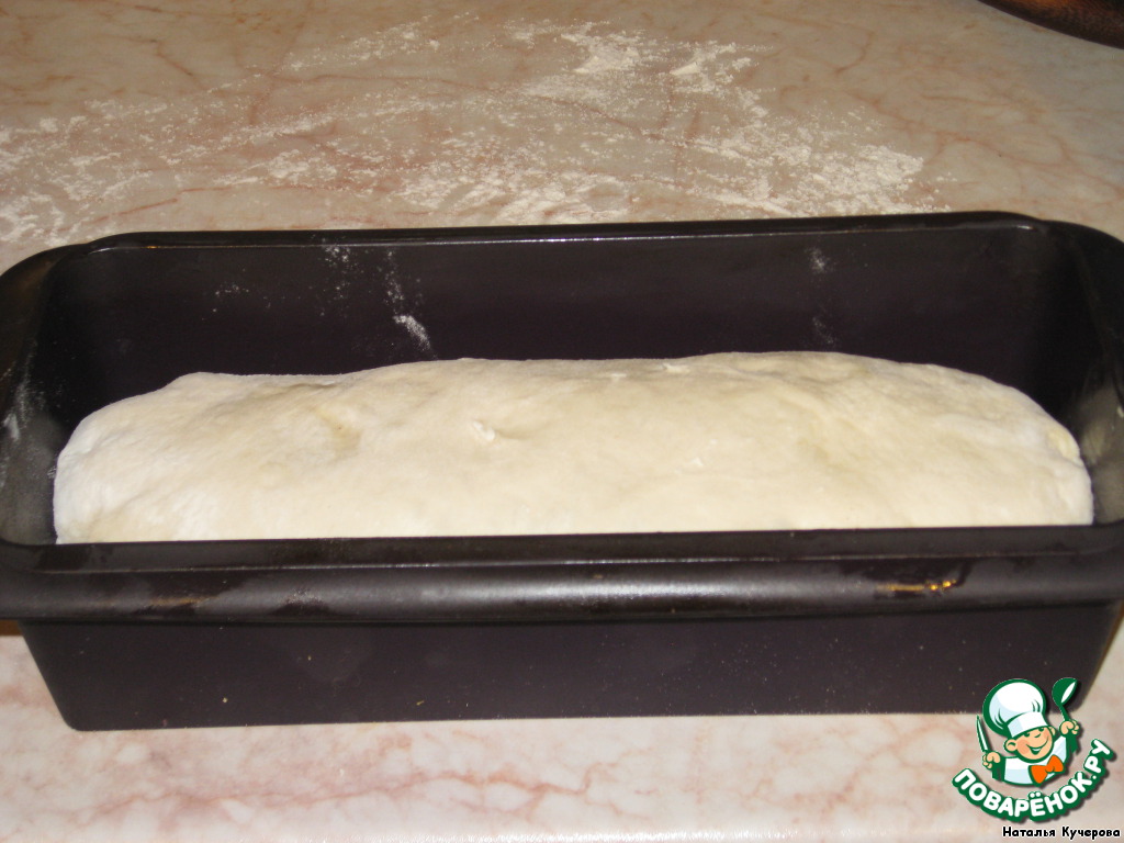 Уложите батон(ы) в формы и оставьте расстаиваться на час в теплом месте, подальше от сквозняков. Постоянно присматривайте за ними во время расстойки: как только тесто дойдет до краев формы, закройте ее крышкой или тяжелым противнем, чтобы оно не вылезло наружу. Это по рецепту. Я не закрывала. Честно говоря, мне очень нравится запеченная корочка. Но классический хлеб для тостов делают именно так.