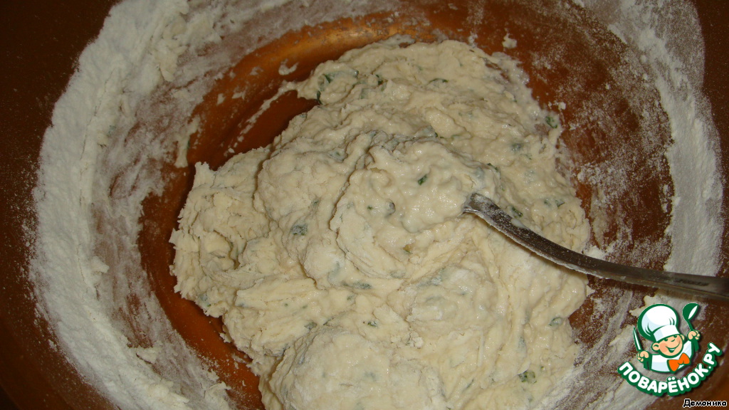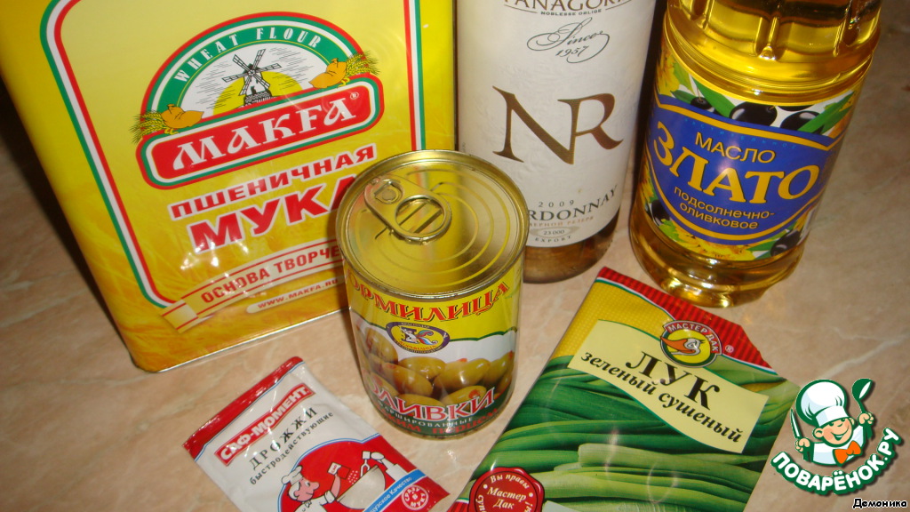 Смешать муку, дрожжи, соль. Влить вино, 1 ст.л. масла и 150 мл тёплой воды. Добавить сушёный лук.