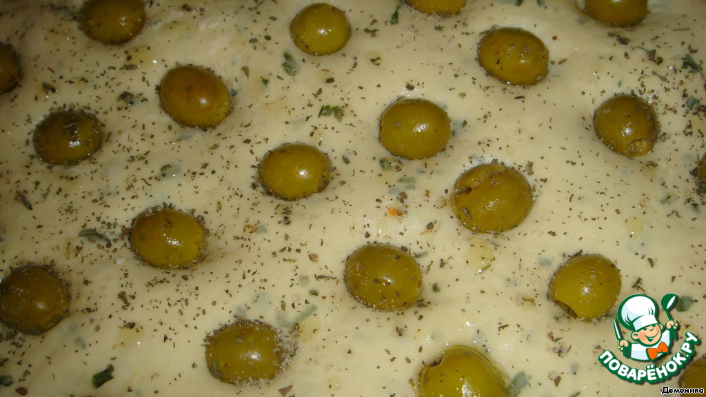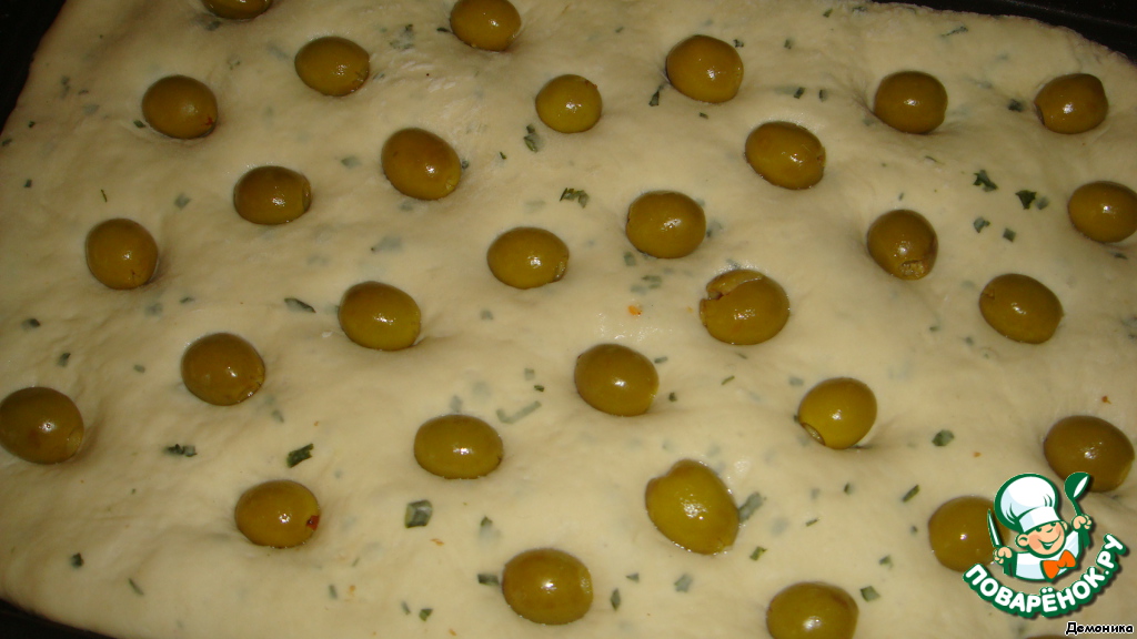 По всей поверхности теста сделать углубления пальцем и вдавить в них оливки. Оливки я беру с начинкой, так интереснее. Сегодня - с красным перцем.