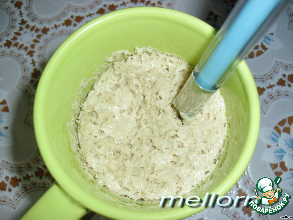 Развести дрожжи в теплом молоке (50 мл) и 1 чайной ложке сахара. Дать подняться.