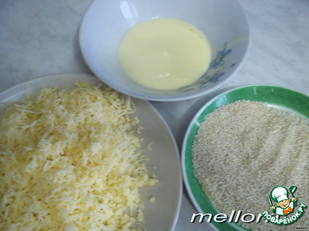 Сыр натереть на мелкой терке. Маргарин растопить. Приготовить три тарелки: с сыром, маргарином и кунжутом.