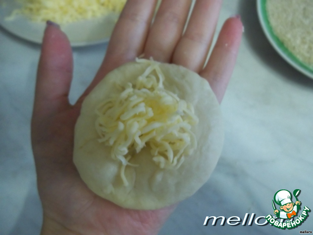 Поднявшееся тесто разделить на «шарики» с грецкий орех. Руками размять каждый «шарик», на середину выложить сыр и закрыть его со всех сторон придавая тесту форму "шарика".