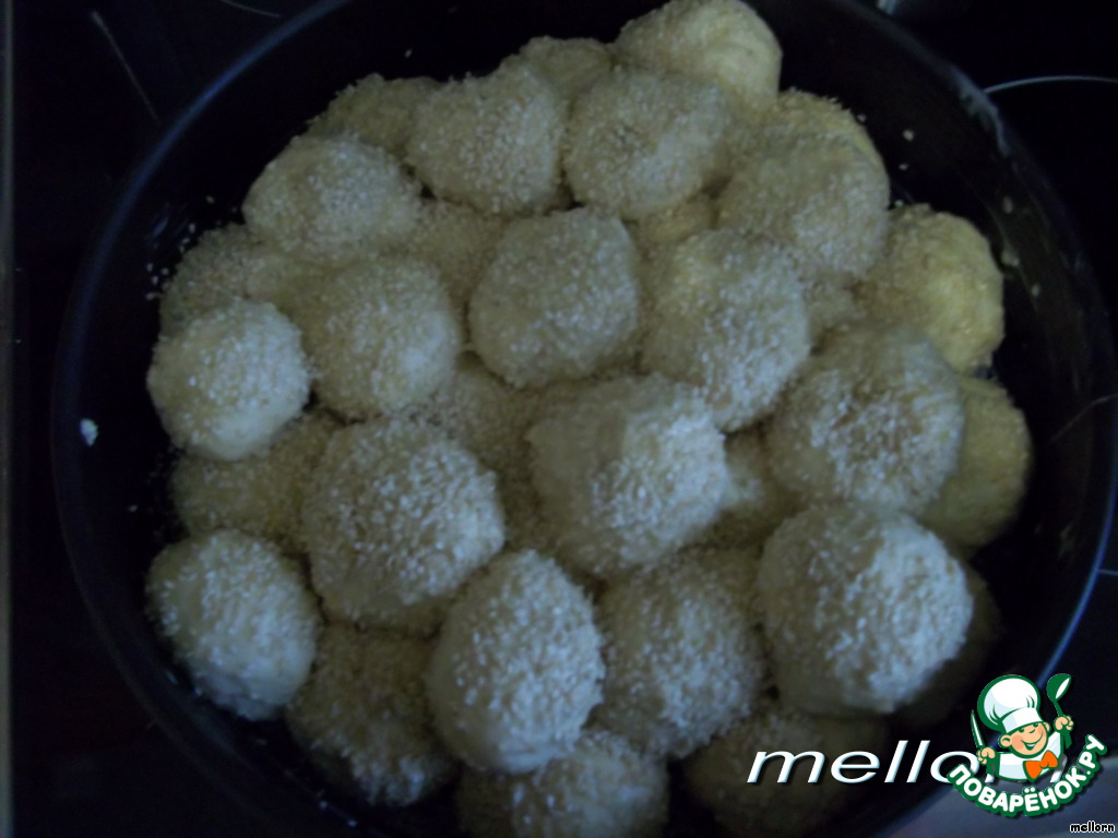 «Шарик» окунуть в масло, а затем обвалять в кунжуте.