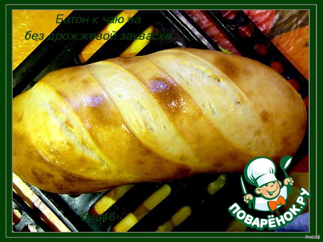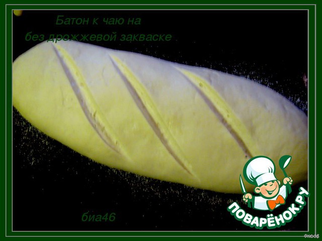 Утром достаем наше тесто, даем ему часок на акклиматизацию, выкладываем на смазанный растительным маслом стол, разминаем тесто в прямоугольник и формируем батон, оставляем его для расстойки на разделочной доске, присыпанной манкой часа на 1,5-2, делаем надрезы острым ножом, сбрызгиваем водой и аккуратно стряхиваем на горячий противень, ставим в разогретую духовку на 250 гр Ц на первые 15 минут (печем с паром), потом температуру снижаем до 200 гр Ц (воду убираем из духовки и еще раз сбрызгиваем батон водой), печем еще 20-25 минут (в моей духовке всего ушло 35 минут).