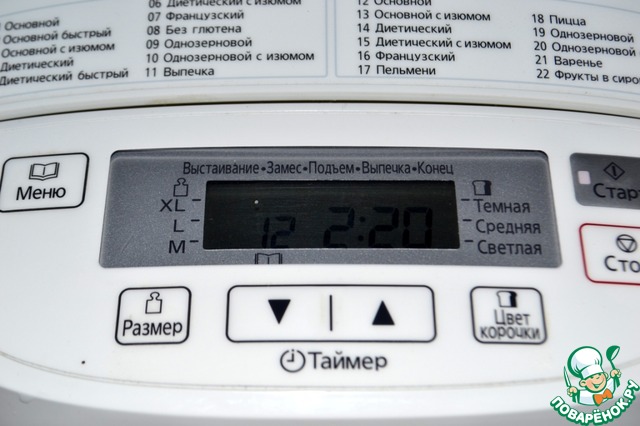Выбираем режим "Основное тесто" (или просто "Тесто") и нажимаем кнопку "Старт". Если же вы хотите испечь просто обычную булочку хлеба, то выбирайте режим "Основной хлеб", размер - М, цвет корочки - средний.