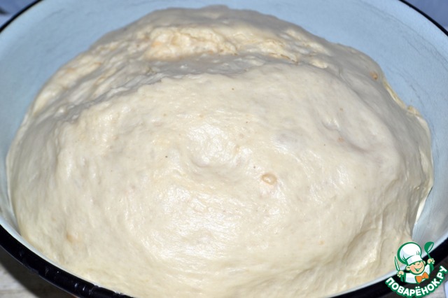 Выкладываем тесто в смазанную растительным маслом чашку, хорошо перебиваем и убираем в теплое место на 1 час (чашку закроем пленкой). Вот такое тесто получается после расстойки.