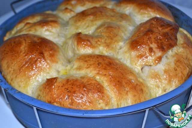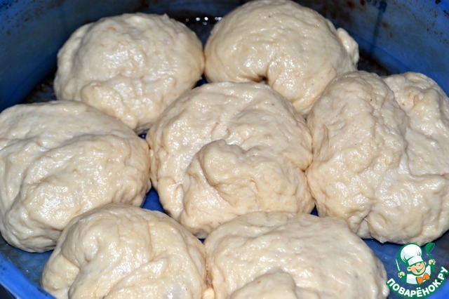 Делим тесто на 7 частей, скатываем шарики и выкладываем в смазанную маслом форму. Убираем на расстойку, накрыв пленкой, в теплое место на 30-40 мин.