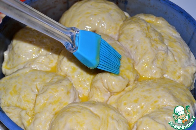 Через 30-40 мин смазываем булочки взбитым яйцом.