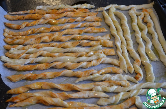 Переложите полосочки на противень, застеленный пергаментом и оставьте в тепле еще на 15-20 минут. Я наши палочки слегка перекрутила. Сбрызните оливковым маслом