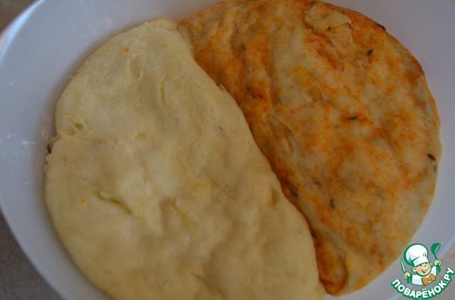 Когда тесто еще не почти готов, делю его на две примерно равные части. в одну-добавляю паприку и тмин