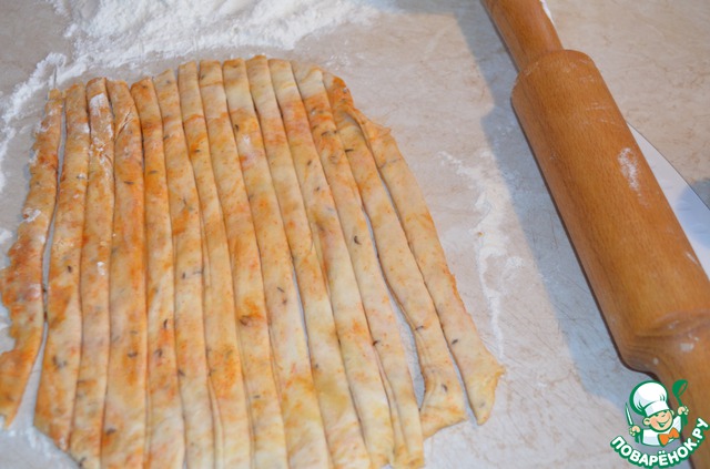 Подошедшее тесто раскатать в пласт толщиной примерно в 5 мм. Нарезать на тонкие полоски