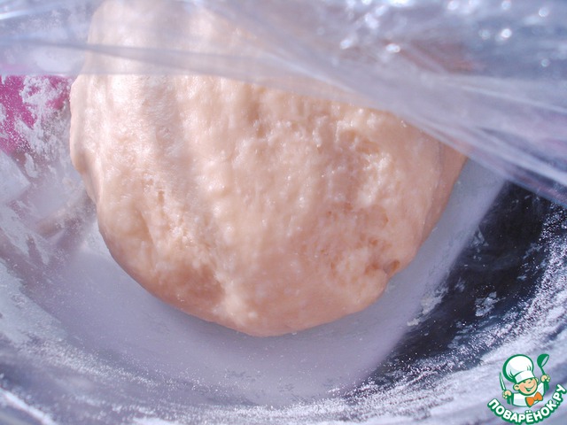 Готовое тесто подкатываем в шар и помещаем в смазанную растительным маслом миску, накрываем полиэтиленом. Ставим в теплое место до увеличения в 2 раза.