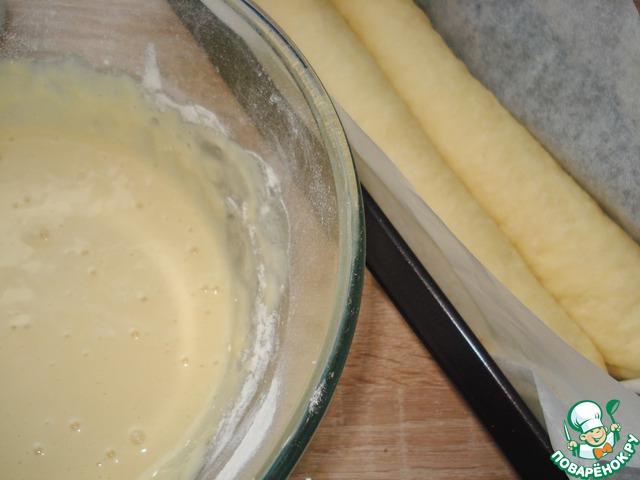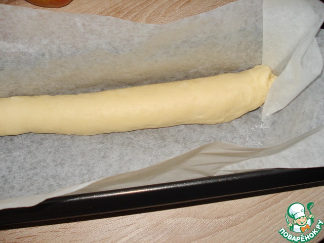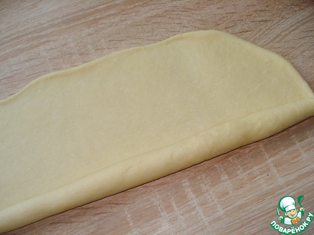Раскатаем каждый кусочек в прямоугольник, по длине, равной форме для выпечки, и скатаем в плотный рулет. Край защипнем.
