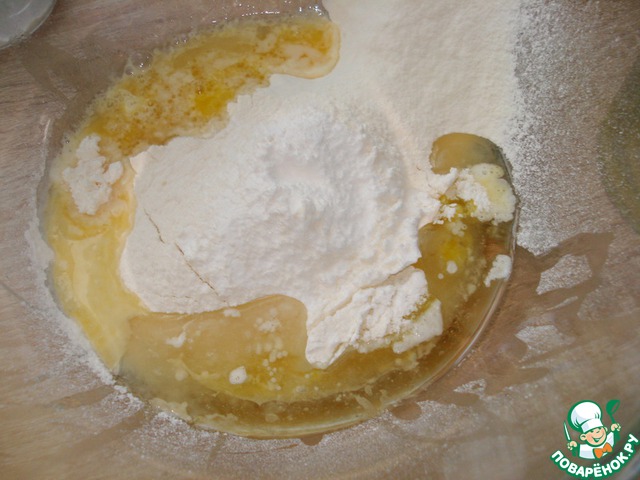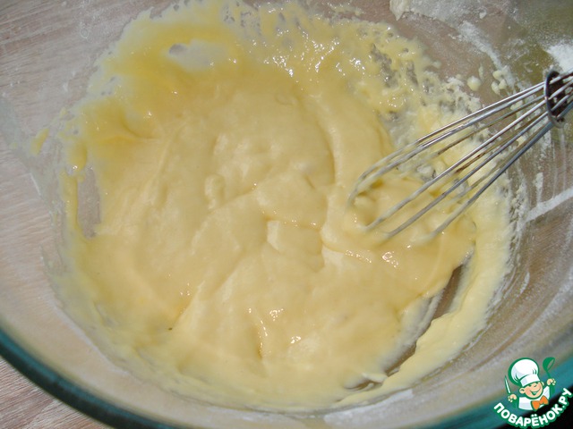 К желткам добавим растительное масло, муку-60 г., разрыхлитель для теста, сок апельсина, сахар-40 г.