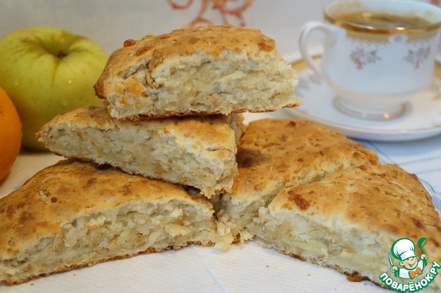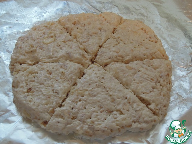 Замесить тесто. Оно получается вязким, поэтому удобнее перемешивать и выкладывать ложкой или силиконовой лопаточкой. Из него сформировать лепешку (высотой 1,5 см.), пригладить мокрой рукой, надрезать лепешку на 6 треугольников, наколоть вилкой.