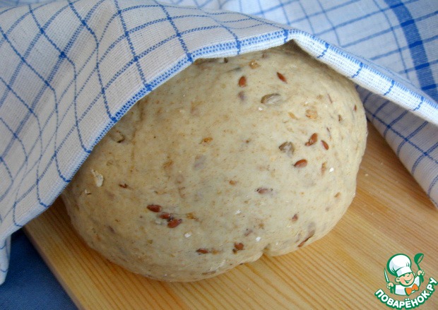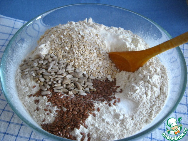Добавить 1ч. л. соли, 25г семян льна, 25г семян подсолнуха, 25г овсяных отрубей.
