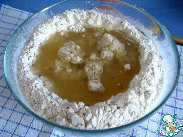 …медовую воду и подошедшие дрожжи. Замесить тесто. Месить не менее 5минут. Сначала тесто будет сильно липнуть к рукам, можно добавить немного, но не больше 1ст. л., пшеничной муки.