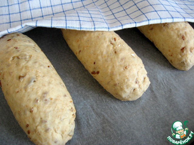 Готовые батончики выложить на противень, смазанный маслом или застеленный бумагой для выпекания, друг от друга на расстоянии 5-7см. Накрыть полотенчиком и оставить для подъёма в теплом месте на 30-40минут.