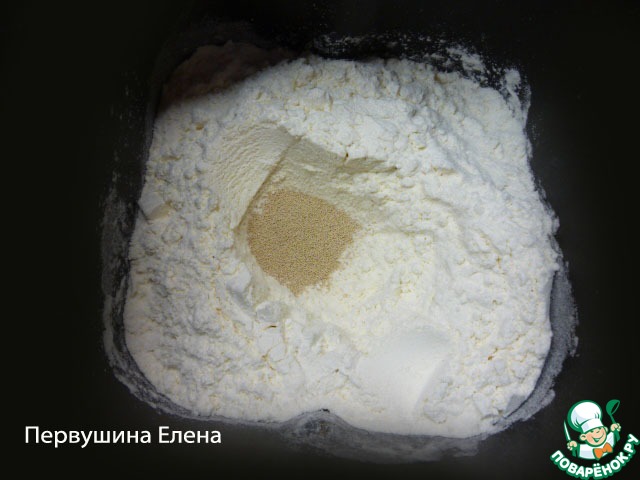 Тесто я замешиваю в хлебопечке: смешиваю растительное масло с водой, сахаром и солью. Сверху кладу муку (просеянную и смешанную с рисовой крошкой), делаю небольшую лунку и добавляю в эту лунку дрожжи.