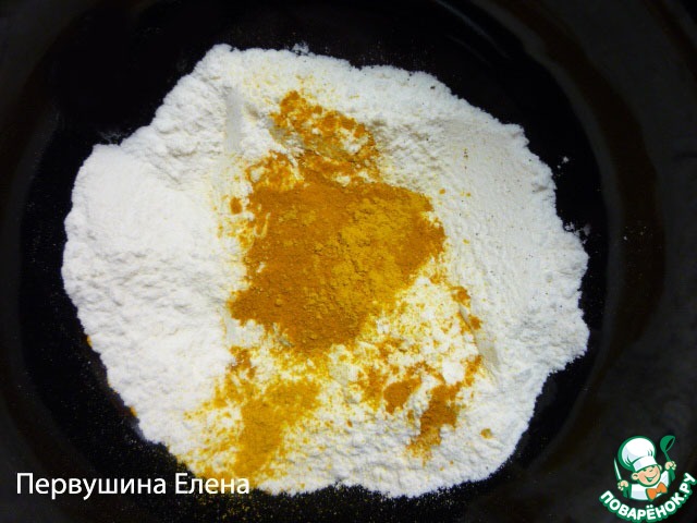 В отдельную чашку кладем столовую ложку с горкой муки, добавляем куркуму и
