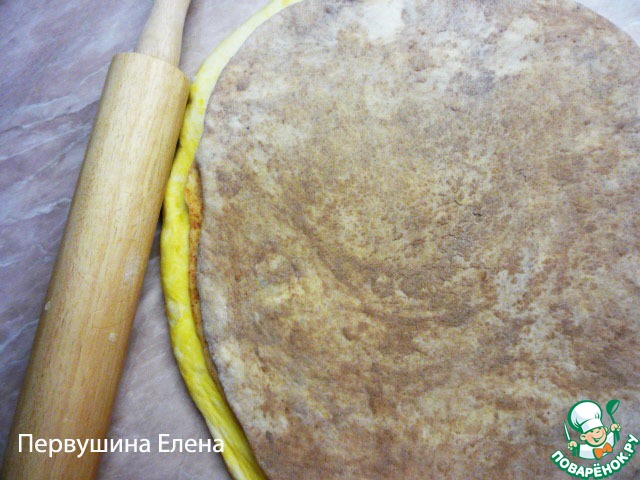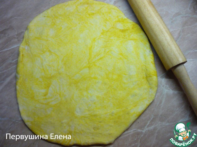 Раскатываем желтый "комок" теста в пласт.