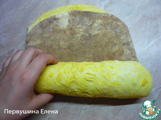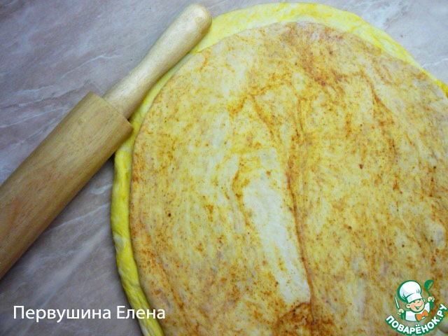 Так же раскатываем "комок" с паприкой в пласт и кладем на желтый.