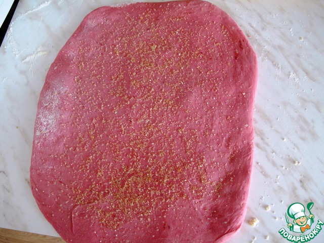 | Очень необычное дрожжевое слоёное тесто, напоминающее по фактуре слойку. Мякиш пушистый, пышный. Вкус сладко-сливочный, сдобный. Очень необычна на срезе. Густо-розовый цвет создается за счет присутствия красного греческого шафрана. Если у вас шафран обычный желтый, или его нет совсем, то цвет будет обычный. |