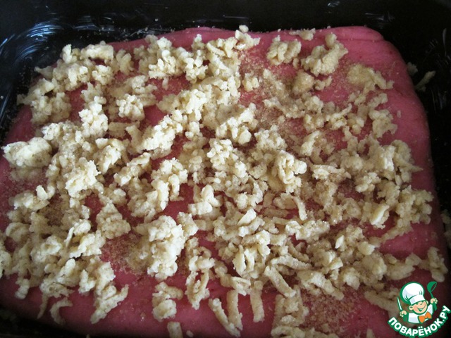 Тесто кладем в форму. При выпечке оно сильно поднимется. Посыпаем штрейзелем и ставим в духовку на полчаса при температуре 50 градусов на расстойку. Тесто очень сильно поднимется.