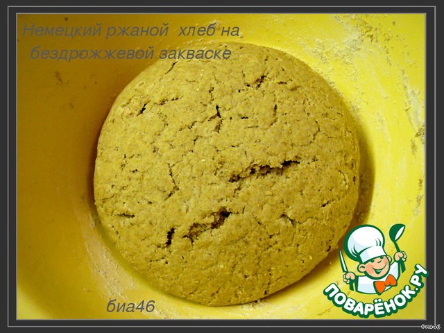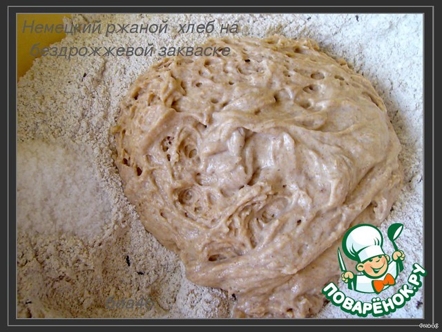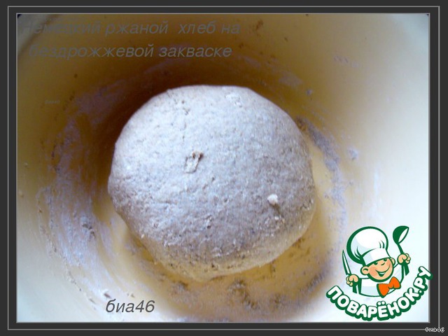 Достаем смесь из микроволновки, перемешиваем, делаем луночку, и в нее выкладываем спелую ржаную закваску. Вливаем теплую воду и вымешиваем на столе (муки подсыпать немного) .