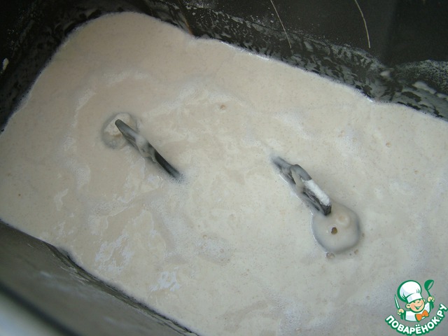 Делаем жидкую опару: 150 г. закваски + 250 г. теплой воды + 120 г. муки. Замешиваем до однородности. Оставляем для ферментации на 2,5 часа при комнатной температуре.