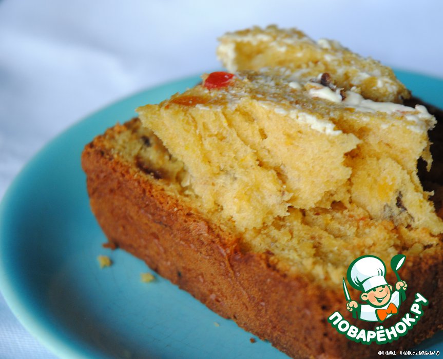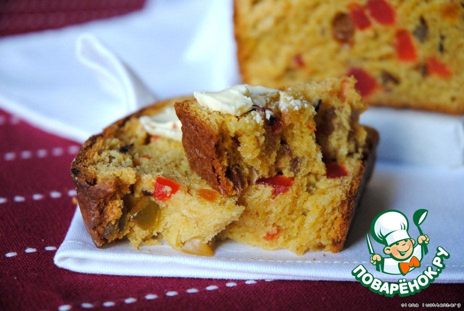 | Сладкий, насыщенно-желтый хлеб с сухофруктами украсит любой чайный стол. Особенность этого изделия в мякише, который похож на смесь хлеба и кекса: пористый, эластичный, но, в то же время, плотный и сдобный. |
