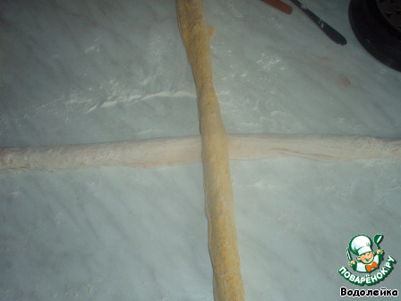 Теперь берем и раскатываем каждый кусочек в длинные "колбаски". И кладем крест на крест.