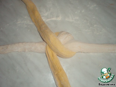 Формирование такого жгута - это не принципиально. Можно переплести как угодно, по своему желанию. Так же можно каждый кусок теста поделить еще пополам и получится уже 4 "колбаски". Сделать можно косу из 4 кусочков. У меня в дневнике есть несколько видео о формировании хлеба. Можно посмотреть и оформить по другому. http://www.povarenok.ru/blog/show/8429/