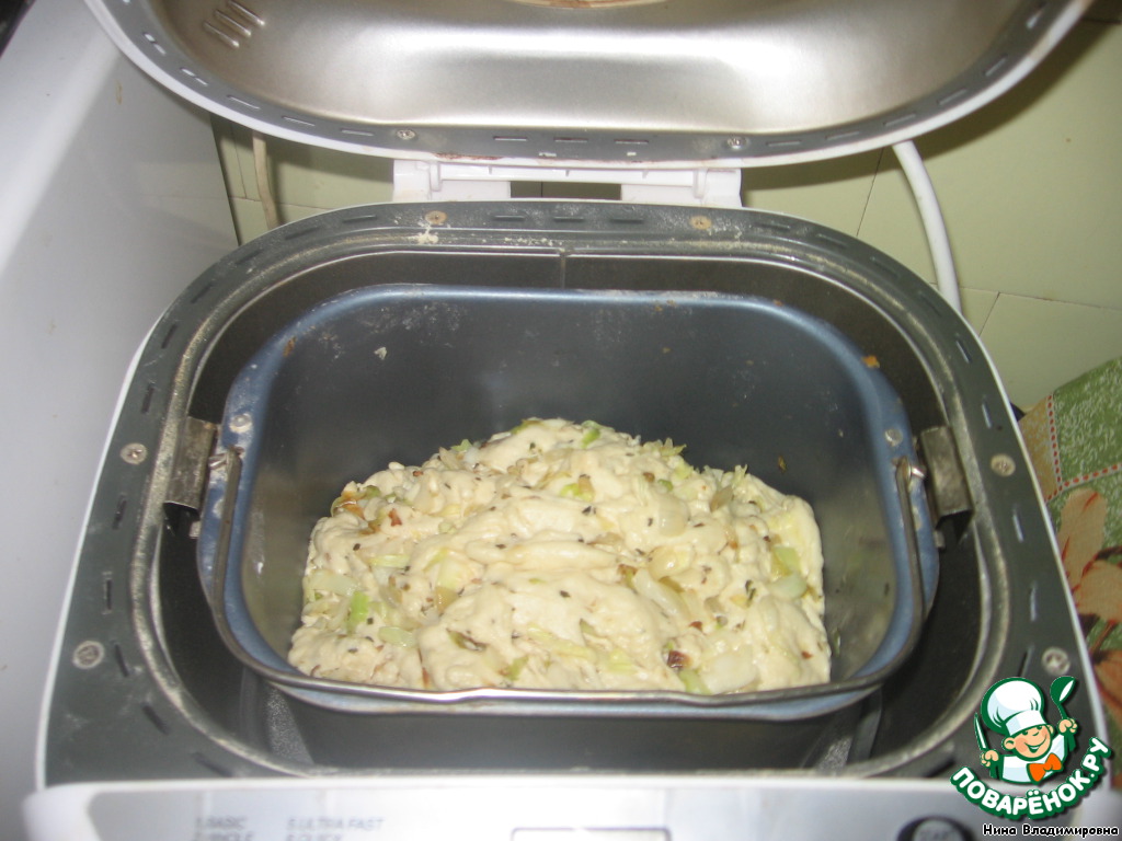 Заложить ингредиенты, кроме овощей, в ведерко согласно инструкции вашей печки. Режим базовый или хлеб с изюмом (соответственно капусту закладывать или после сигнала или в диспенсер). Корочка средняя.
