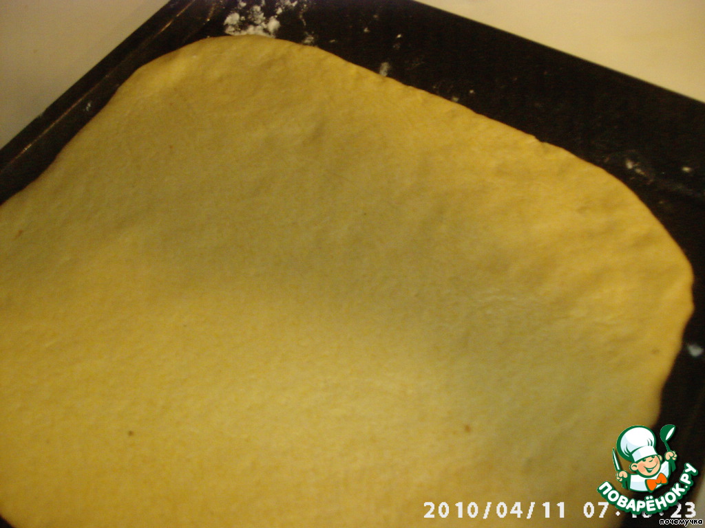 Раскатаем тесто до толщины 20-25 мм, придав ему форму лепешки диаметром 35 см, выложим на смазанный оливковым маслом и присыпанный мукой противень.