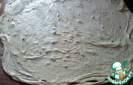 Теперь аккуратно скатываем в рулет, при этом вытягивая тесто. Рулет скатываем в круг, помещаем в заранее разогретую сковороду. Смазывать маслом сковороду не надо.