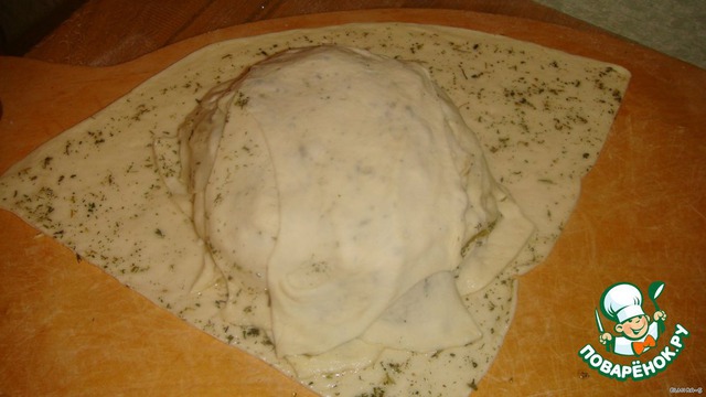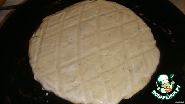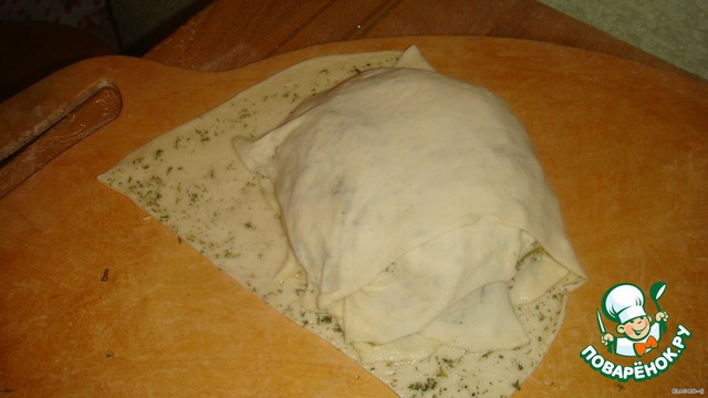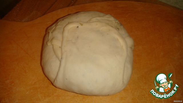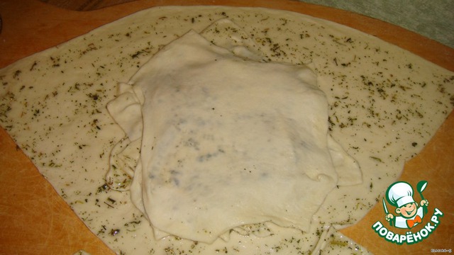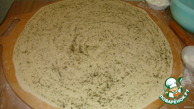 Тесто делаете дрожжевое (но очень удобно этот хлеб делать, когда вы что-то готовили из дрожжевого теста и оно у вас осталось). В общем раскатайте большой пласт, посыпьте на него соль и траву "миркимура", потом полейте маслом и распределите по всему пласту.