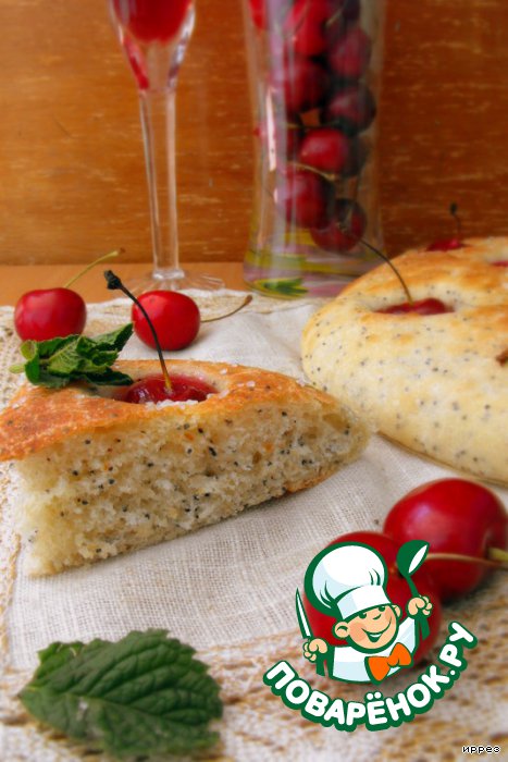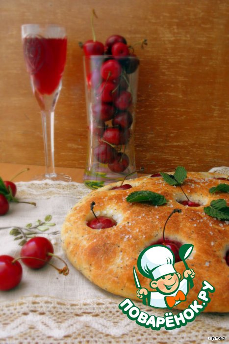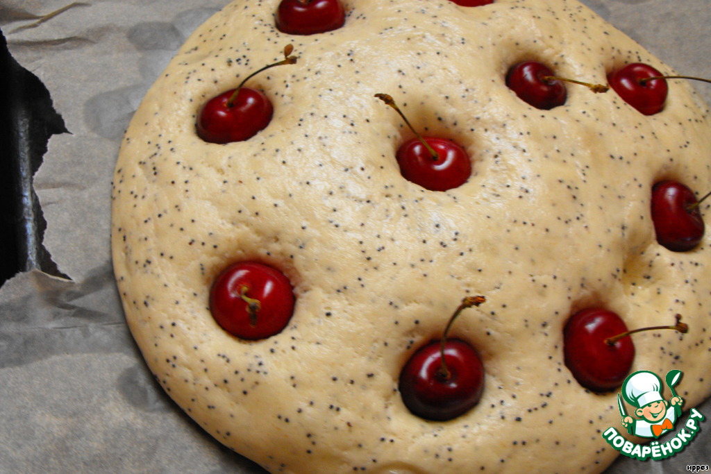Выложить на лепешку черешню, вдавить в тесто, сбрызнуть (смазать) оливковым маслом, посыпать крупной солью, можно маком.