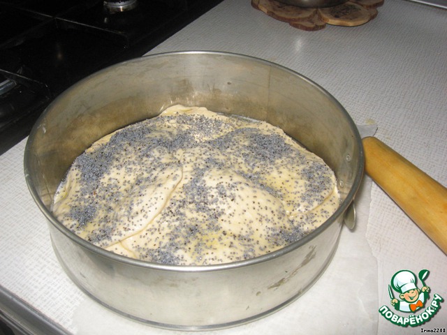 Если масло осталось - вылить его сверху. Верх изделия присыпать маком (можно смазать яйцом и посыпать любыми семечками) и оставить тесто подходить в форме до увеличения в размере в 2 раза.