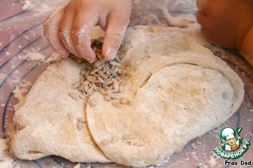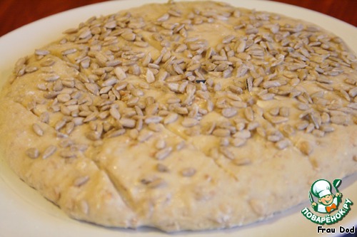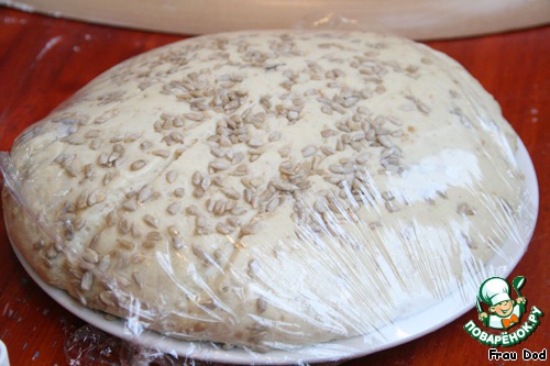 Переложить тесто на пергамент на противень, накрыть полотенцем и поставить на 30 минут в теплое место. На фотографии - неудачное решение. В соответствии с рецептом из журнала, накрыла пищевой пленкой и оставила на тарелке. Пленка и тарелка прилипли, пришлось снова помесить тесто и сверху не осталось насыпанных семечек.